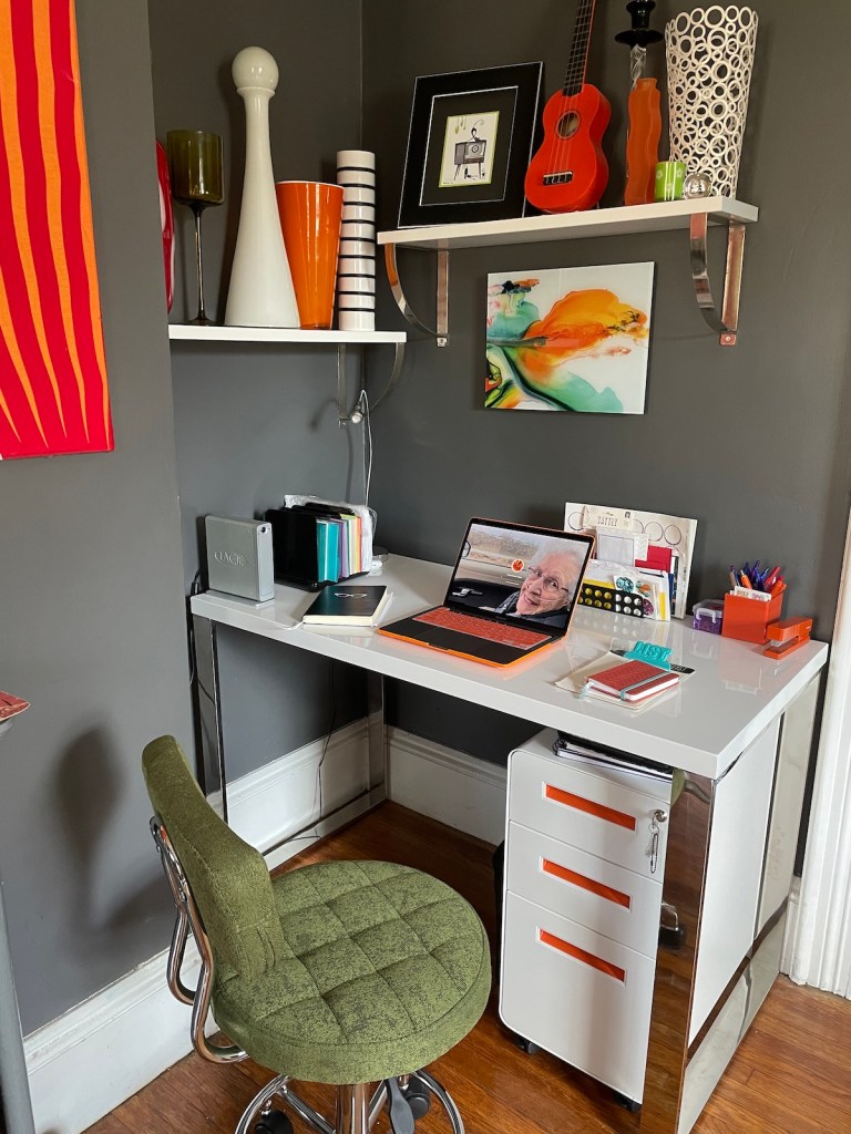 As a visual soul, I know how much I crave a space that delights both my eyes and my heart. Still, like many artists, I’ve often shoved self-care to the bottom of the to-do list, blaming it on busy days or my guilt that whispers, “Should you really spend money on that?” But here’s the secret I’ve uncovered: creating a shiny new and inspiring workspace isn’t just a fancy treat, it’s a vital ingredient in my creative magic. So, I filled my nook with all the good vibes: splashy favorite colors that make me smile, my own art cheering me on, fun collectibles that bring a grin, and my laptop wallpaper of my mom, the ultimate cheerleader whose traditional taste never stopped her from admiring my abstract art. Now, this revamped office feels like a happy dance waiting to happen, a joyful launchpad where this gal’s creativity can take flight.