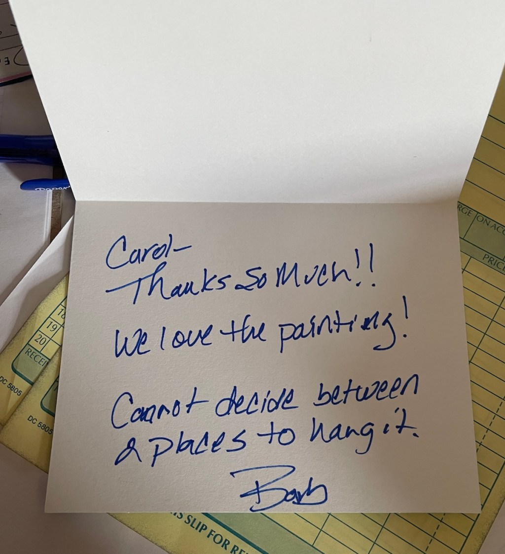 Warm & Fuzzy feels so good. I recently received this note from a woman who purchased my very first oil painting! I questioned whether to include it in my exhibit but through some familial encouragement I went ahead with it. Well, let’s just say it was the right decision, not only did it become the first sale of the exhibit it also was responsible for this incredibly thoughtful note. As she was writing this I would guess she didn’t fully recognize the impact this would have on me. I always feel so thankful for my customers and followers so to receive these kind words reminds me that art moves people. We can all make a difference in someone’s day by these gestures that often don’t come to fruition solely due to a busy life. Make the moment happen, we all need some warm & fuzzy in our lives.