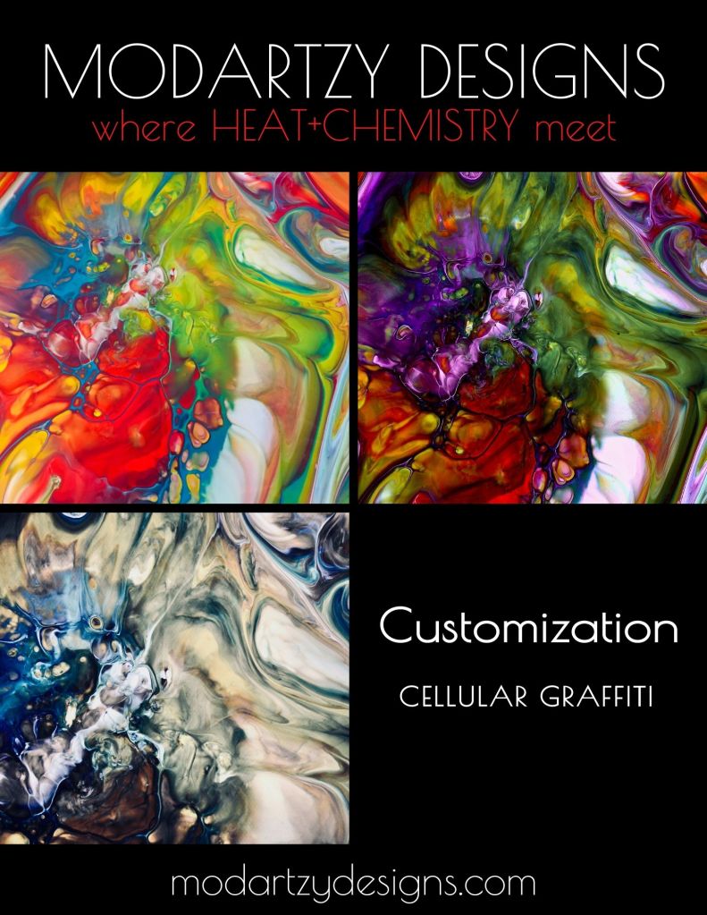 Heat+Chemistry is a division of Modartzy Designs. The name derives from the technique I use to create the fluid paintings which is the staple behind my prints and greeting card line. The method fuses paint, various mediums, and heat to create layered designs through the fluid movement of poured paint, requiring an exact blend of ingredients for a successful outcome.